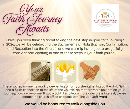 At St. Cuthbert’s, we warmly invite you to join us for worship and discover a welcoming community rooted in faith, hope, and love. Whether you are exploring church for the first time, returning after time away, or seeking a place to grow deeper in your spiritual journey, you will find open doors and open hearts here. Through meaningful liturgy, inspiring music, thoughtful preaching, and heartfelt prayer, we gather each week to encounter God’s presence and be strengthened for service in the world. Come as you are — there is a place for you among us.